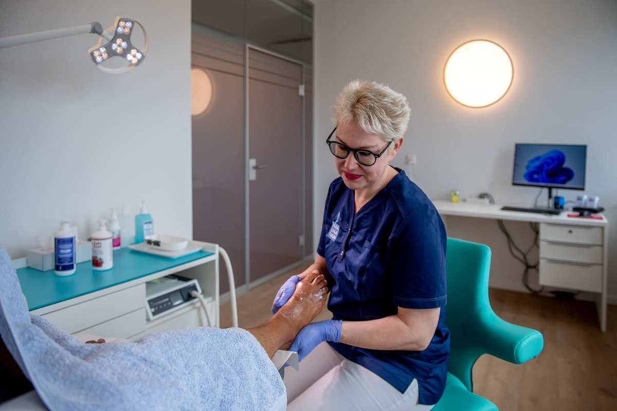Ein Treiber für das Wachstum von Podologie Thun ist das Berufsbild, dass sich rasant verändert. Wer in der medizinischen Podologie arbeitet, hat mindestens eine dreijährige Ausbildung mit eidgenössischem Abschluss durchlaufen; nach weiteren drei Jahren winkt ein HF-Abschluss, der es erlaubt, Neu- oder Quereinsteiger oder -einsteigerinnen auszubilden. So wie Fabienne Bettschen – mit aktuell sechs, bald acht Auszubildenden im Alter von 16 bis 49 Jahren, die neu einsteigen oder zum Beispiel aus der Pflege umsteigen.